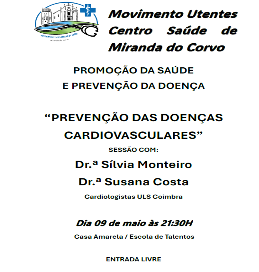 O evento terá lugar no próximo dia 9 de maio, pelas 21h30, na Casa Amarela / Escola de Talentos, em Miranda do Corvo, e contará com a intervenção da Dr.ª Silvia Monteiro e Dr.ª Susana Costa, médicas cardiologistas da ULS Coimbra.